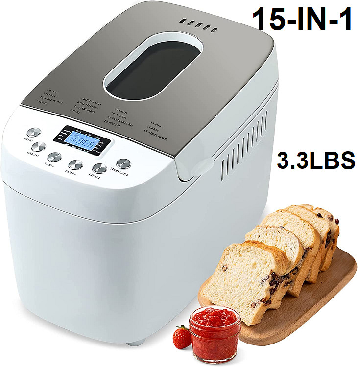 PATIOER 15-IN-1 AUTOMATIC BREAD/DOUGH MAKER, - 3 LOAF SIZES, 3 CRUST COLOURS - WHITE (MODEL: BM8906)
