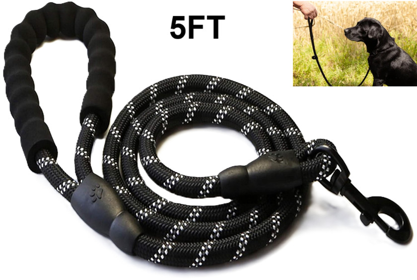 cian heavy duty light stretch dog walking/recall training leash with foam handle - 5ft - black/white