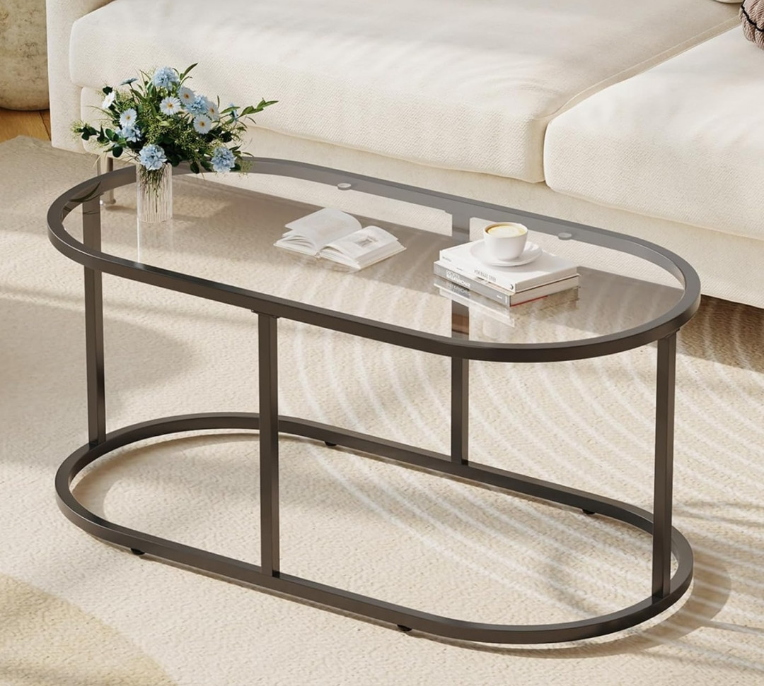 Wolawu Oval Glass Coffee Table with Sturdy Metal Frame - 39.3" x 19.6" x 17" - black (model: hm3059)