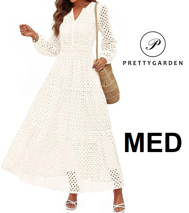 Women's PRETTYGARDEN Long Sleeve Maxi Dress V-Neck Hollow Out Eyelet A-Line Long Flowy Dress - white
