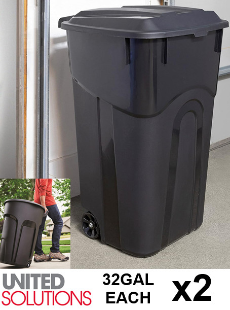 2 united solutions wheeled trash can with handle and flip lid - 32gal each - black - (model: TI0088)