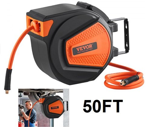 Retractable Air Hose Reel - 3/8 IN x 50FT - Hybrid Air Hose - Max 300PSI - orange - (model: nwa-d15)