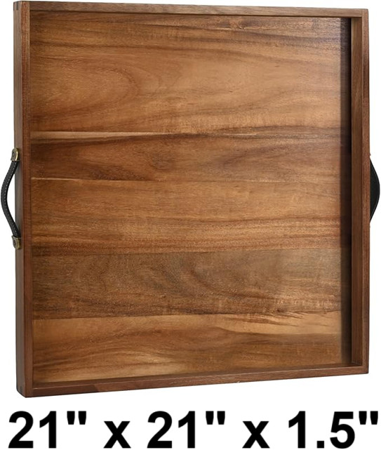 JOY&GRACE ACACIA WOODEN SERVING TRAY WITH leather HANDLES - 21" x 21" x 1.5" (model: st-m06-wod-s01)