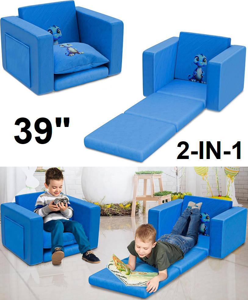COOL KID CREATIONS 2-IN-1 FLIP OUT TODDLER COUCH WITH SIDE POCKETS - 39" TOTAL LENGTH - BLUE, DRAGON
