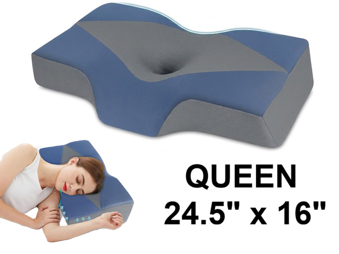 Derila Cervical Ergo Memory Foam Pillow for Neck and Shoulders - 24.5" x 16" (Queen) - Blue and Grey