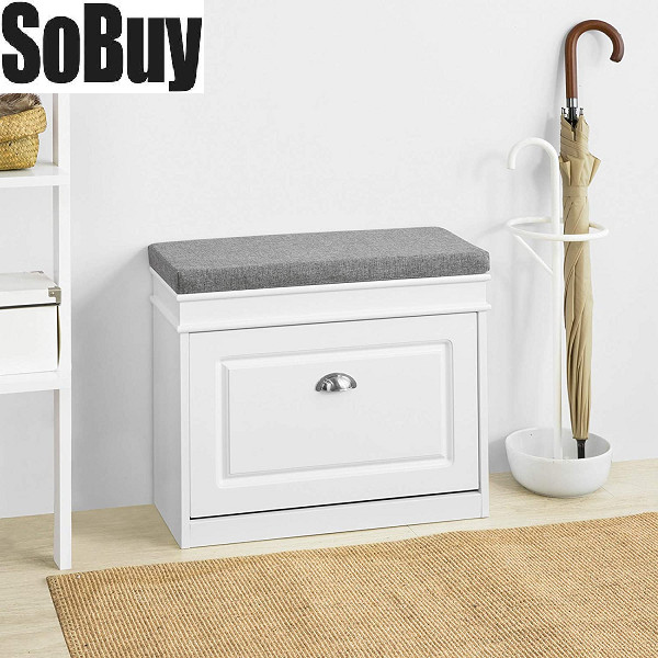 SOBUY HALLWAY SHOE BENCH CABINET WITH FLIP-DRAWER AND SEAT CUSHION - WHITE/GREY - (MODEL: FSR82-K-W)
