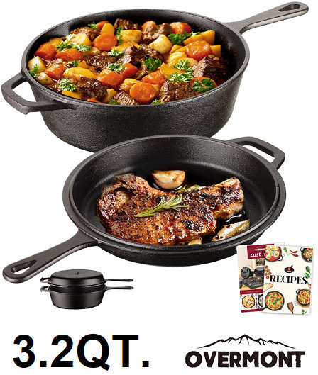 2pc OVERMONT 2-in-1 CAST IRON SKILLET WITH LATCH LID - 3.2 QUART capacity - BLACK - (model: os05915)