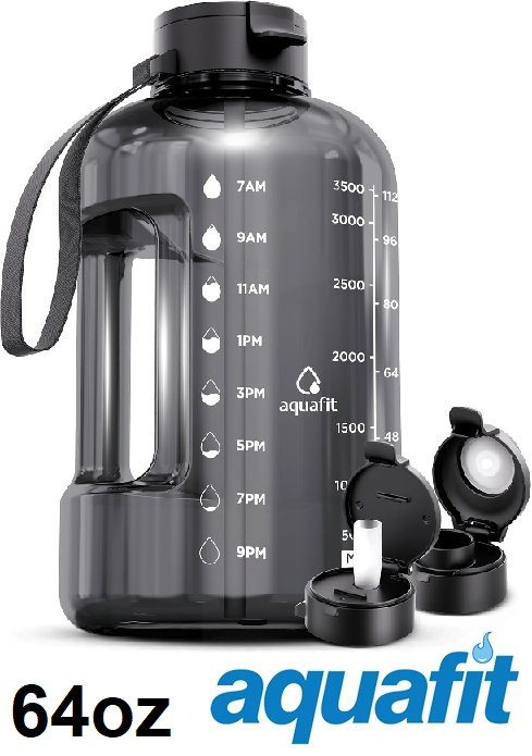 AQUAFIT MOTIVATIONAL TIME MARKER WATER JUG WITH STRAW LID, LARGE GYM WATER BOTTLE - 64 ounces - GREY