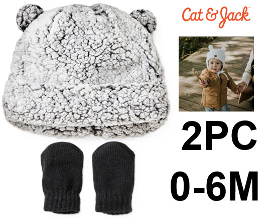 2PC CAT & JACK Baby Faux Shearling Hat and Mitten Set - 0-6 MONTHS - GREY /BLACK (STYKE:328 03 0806)