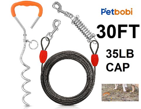 petbobi dog tie-out cable with durable spring and stake - 30ft - for up to 35lbs dogs - black/orange