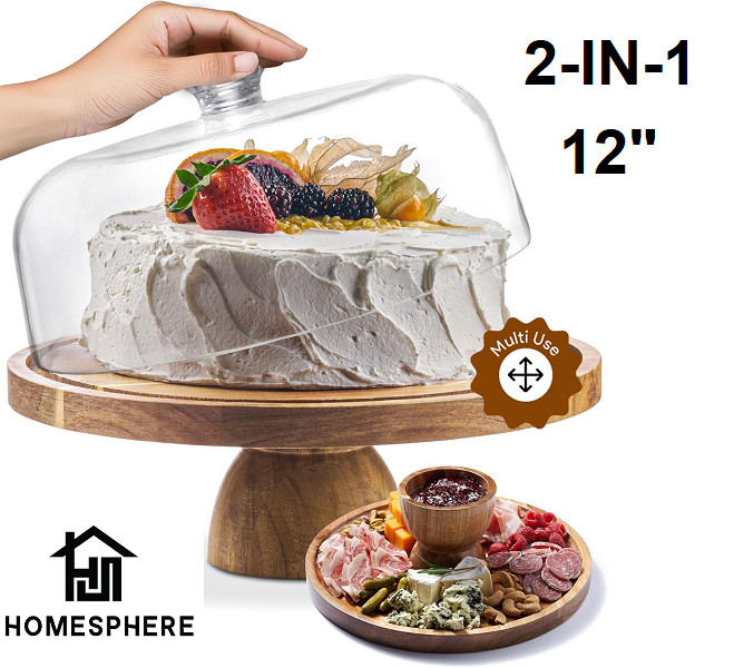 HOMESPHERE 2-IN-1 acacia wood CAKE HOLDER WITH acrylic LID AND charcuterie board - 12" - brown/clear