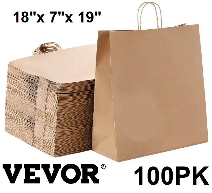 100pk VEVOR Kraft Paper Bags with Handles - 18" x 7" x 19", Reusable & 100% Recycled (model: xd-h07)