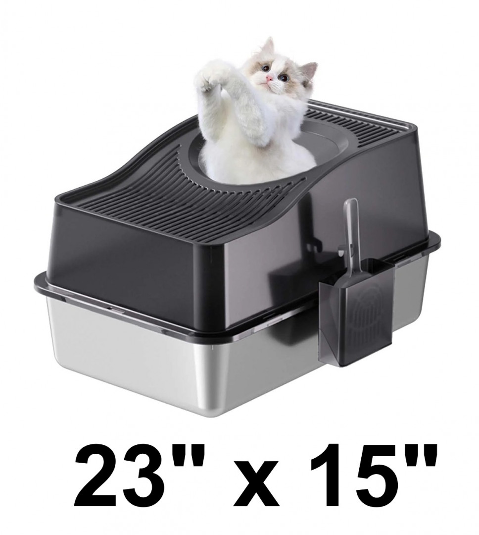 Stainless steel enclosed cat litter box with scooper and litter catching mat - 17"x26" - grey/orange