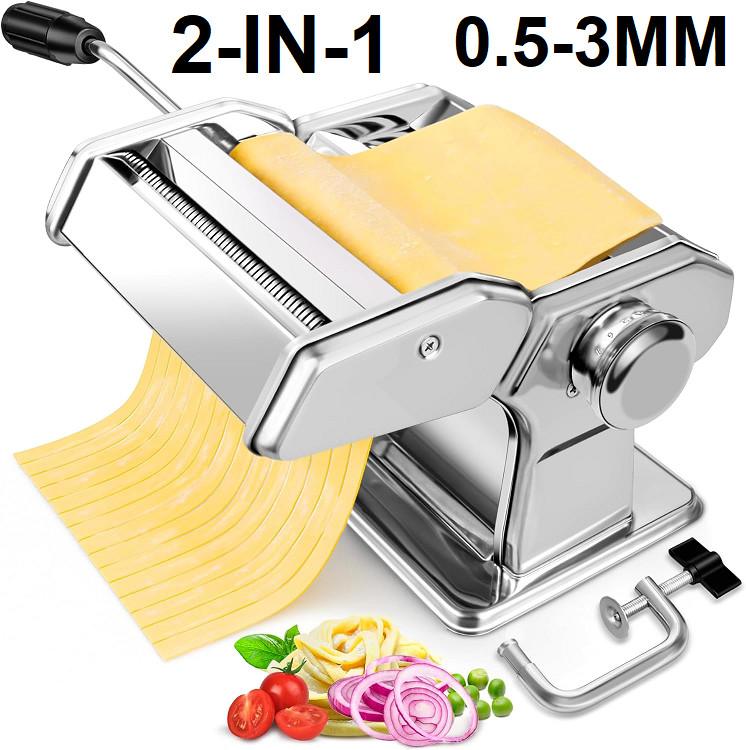 acechef 2-in-1 roller and cutter pasta maker with hand crank and table clamp - 0.5mm to 3mm - silver
