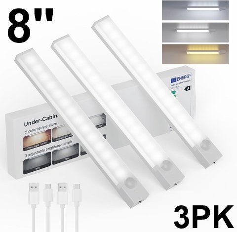 3PK RIHVY INDOOR DIMMABLE MAGNETIC Rechargeable Motion Sensor Under Cabinet Lighting - 3 COLOR - 8''