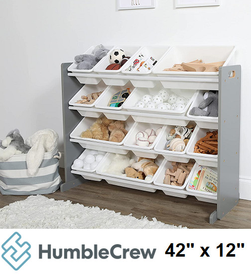 HUMBLECREW KIDS TOY STORAGE ORGANIZER WITH 16 REMOVABLE PLASTIC BINS 42" x 12" - GREY (MODEL: WO135)