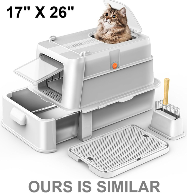 Stainless steel enclosed cat litter box with scooper and litter catching mat - 17"x26" - grey/orange