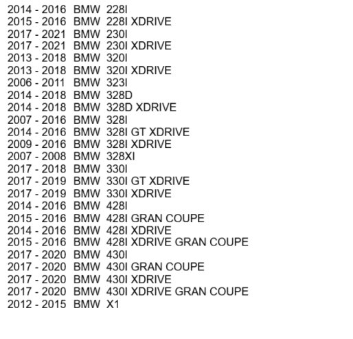 2014 - 2016 BMW 228I 2015 - 2016 BMW 228I XDRIVE 2017 - 2021 BMW 230I 2017 - 2021 BMW 230I XDRIVE 2013 - 2018 BMW 320I 2013 - 2018 BMW 320I XDRIVE 2006 - 2011 BMW 323I 2014 - 2018 BMW 328D 2014 - 2018 BMW 328D XDRIVE 2007 - 2016 BMW 328I 2014 - 2016 BMW 328I GT XDRIVE 2009 - 2016 BMW 328I XDRIVE 2007 - 2008 BMW 328XI 2017 - 2018 BMW 330I 2017 - 2019 BMW 330I GT XDRIVE 2017 - 2019 BMW 330I XDRIVE 2014 - 2016 BMW 428I 2015 - 2016 BMW 428I GRAN COUPE 2014 - 2016 BMW 428I XDRIVE 2015 - 2016 BMW 428I XDRIVE GRAN COUPE 2017 - 2020 BMW 430I 2017 - 2020 BMW 430I GRAN COUPE 2017 - 2020 BMW 430I XDRIVE 2017 - 2020 BMW 430I XDRIVE GRAN COUPE 2012 - 2015 BMW X1
