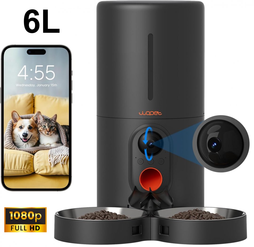 WOPET AUTOMATIC 2 BOWL PET FEEDER WITH 5G wifi, 1080p hd, night vision, 2-way audio - BLACK:‎ (MODEL‎ HV10DP)