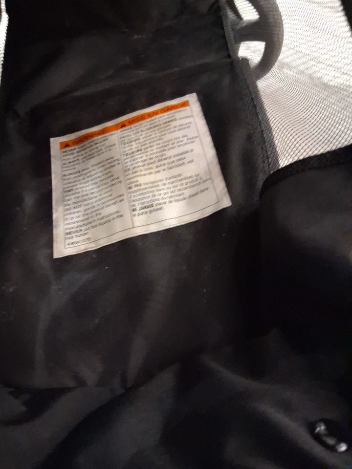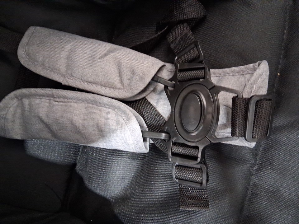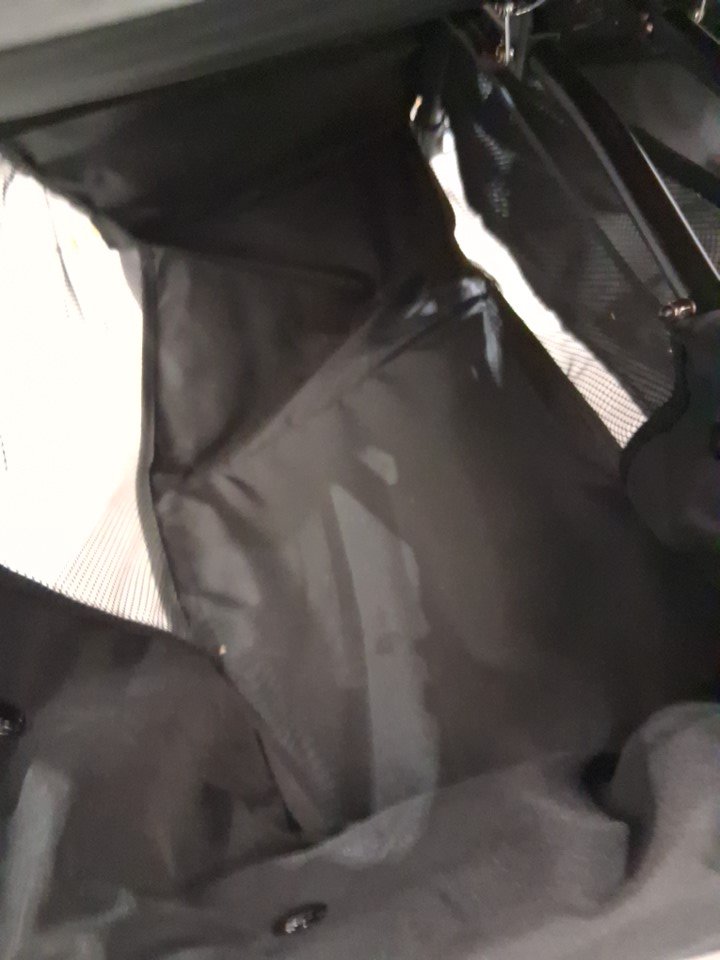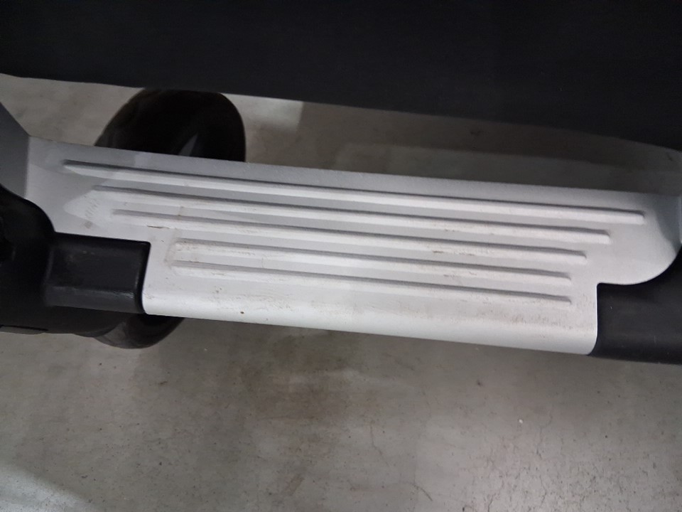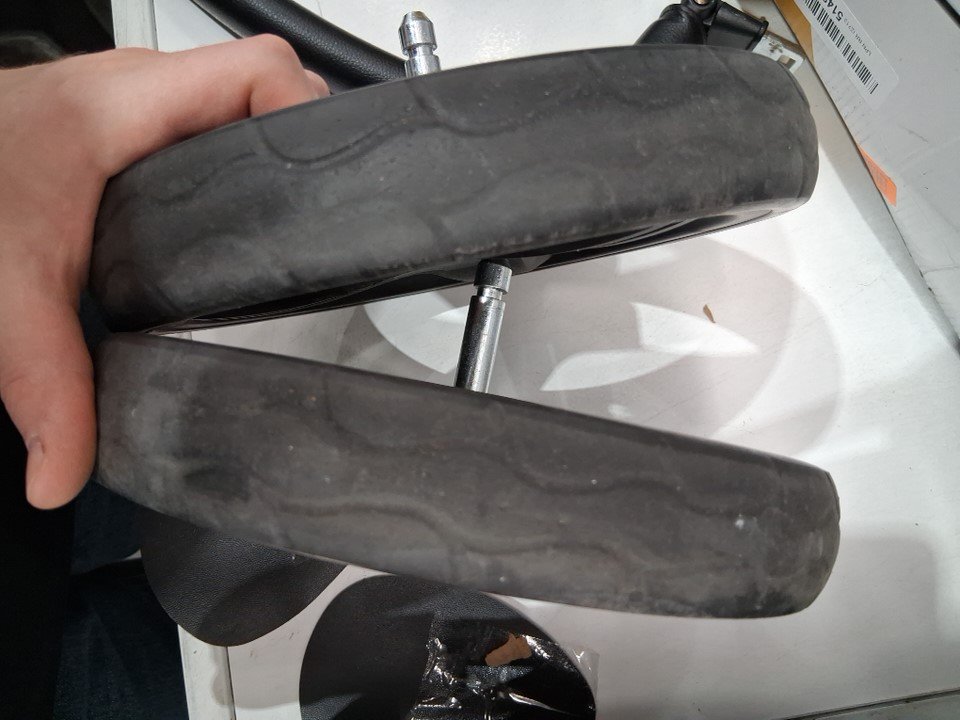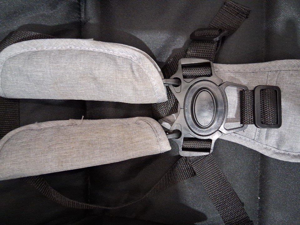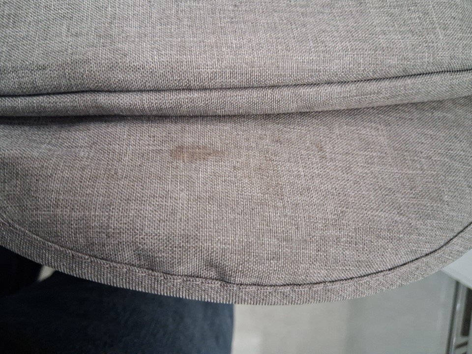 please note there are signs of light use such as light scratching on the footrest, some wear on the wheels, and small stains on the fabric. see photos.