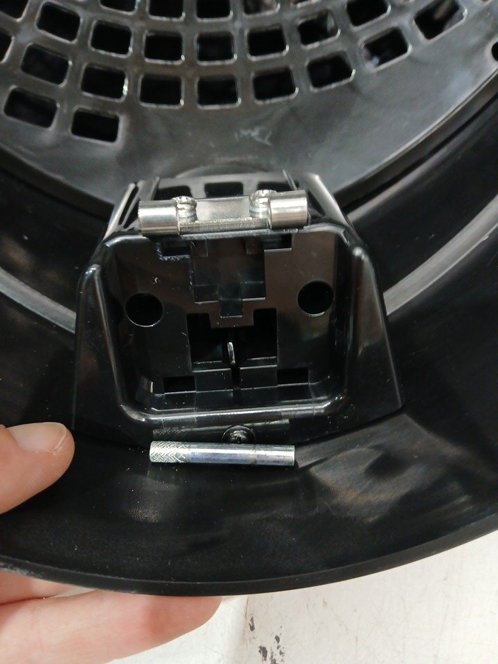The hinge the hold the top on is damaged. The bolt is present but needs to be secured. Tested for power. Minor scrapes on the base.