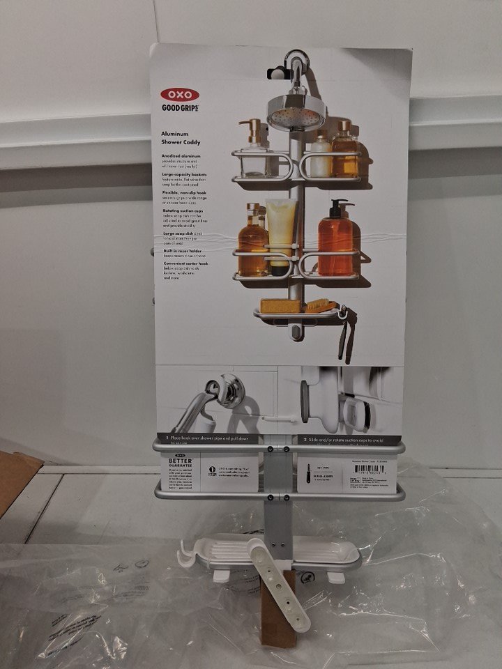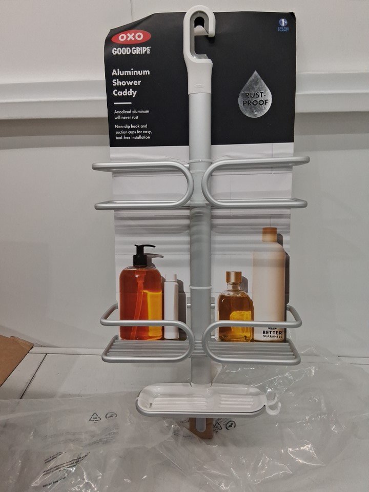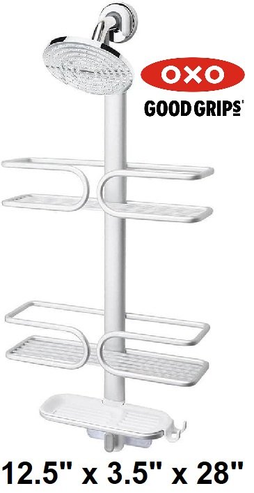 oxo good grips 3-tier aluminum shower caddy - 12.5" x 3.5" x 28" - silver/white