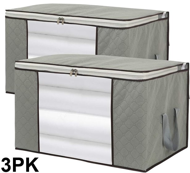 3PK Foldable Jumbo Storage Bags Organizer WITH CLEAR WINDOW AND HANDLES - 22" X 14" X 12" - GREY