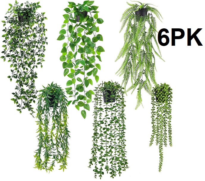 6PK Artificial Vines Faux Hanging Plants WITH POTS - GREEN/BLACK