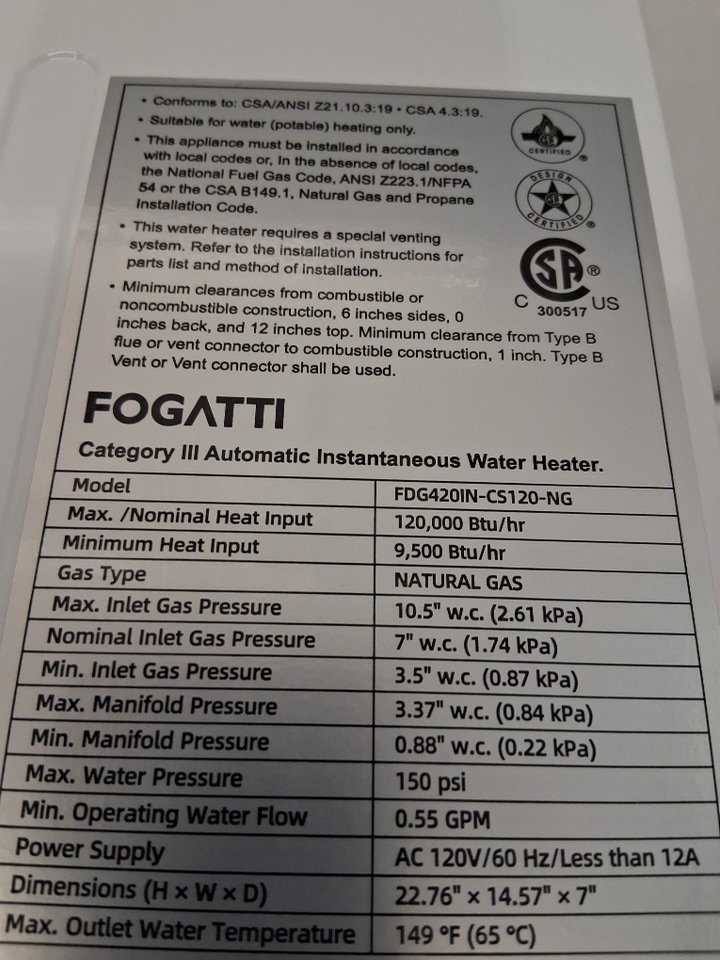 fogatti propane gas tankless indoor water heater - 120,000BTU - white - (model:fdg420in-cs120-ng)