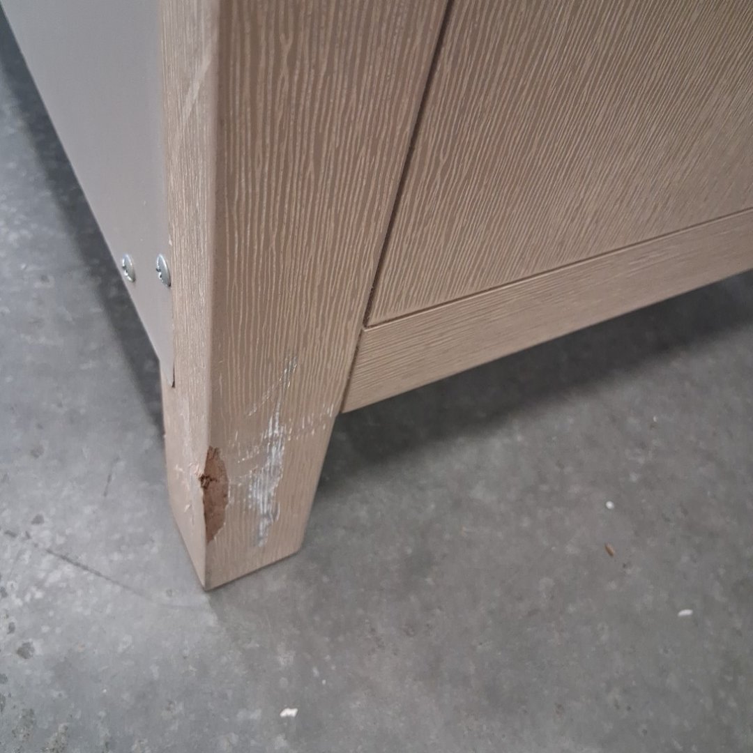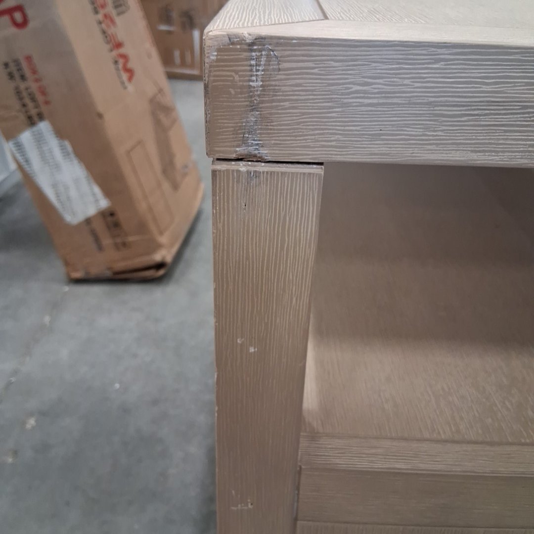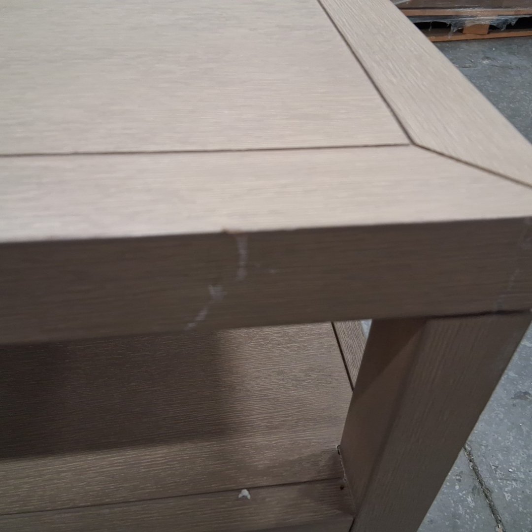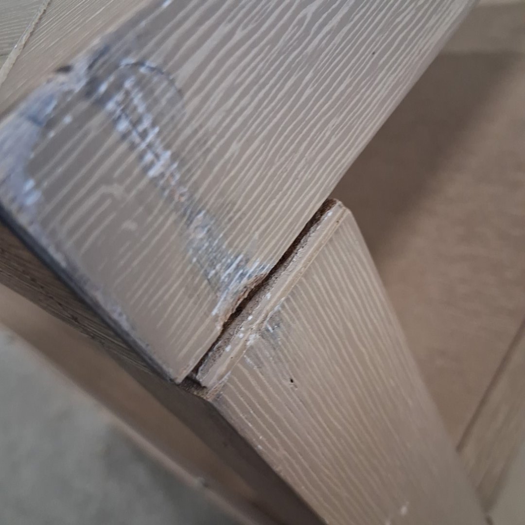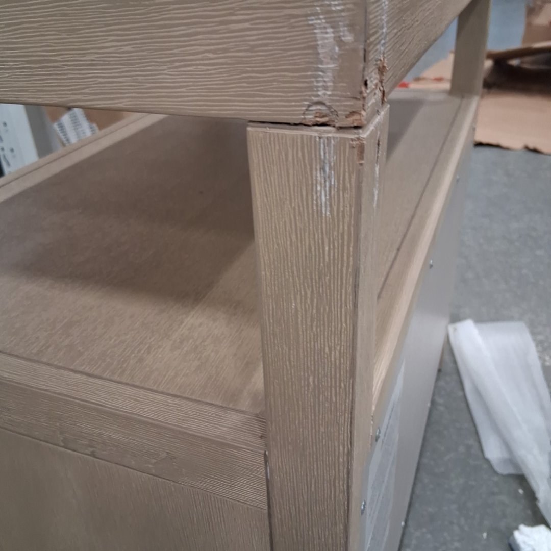 Item has scuff marks along the corners on the top and on the legs. One corner of the top is also coming loose. (see photos)