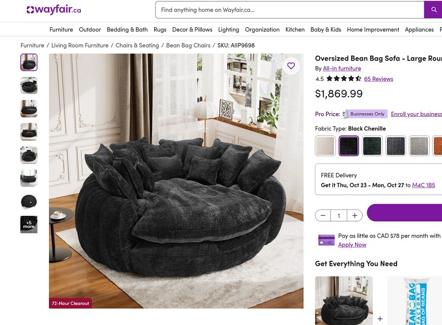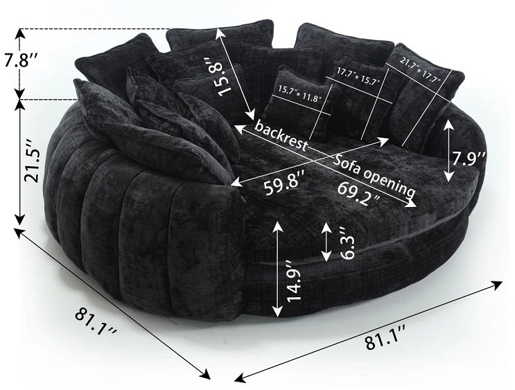 all-in furniture oversized round loveseat bean bag sofa - 21.5" x 81.1" x 59.8" - black chenille (model: mgsn-c12bk01)