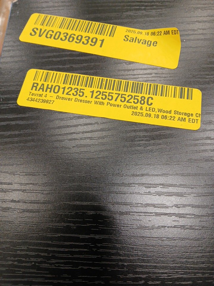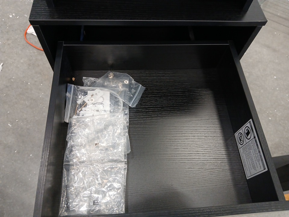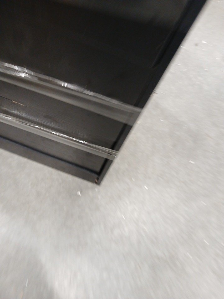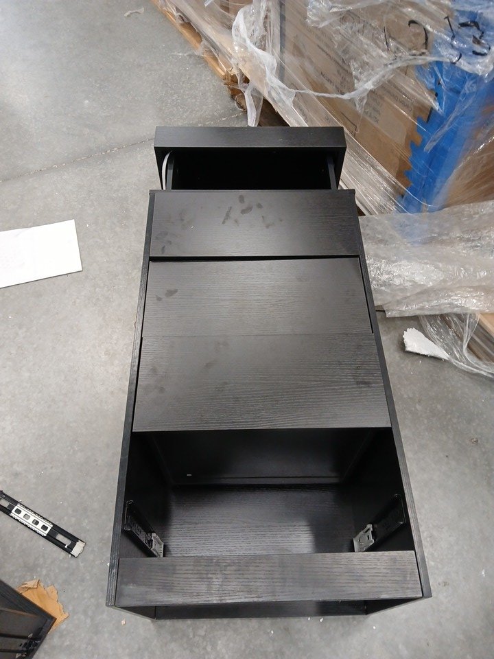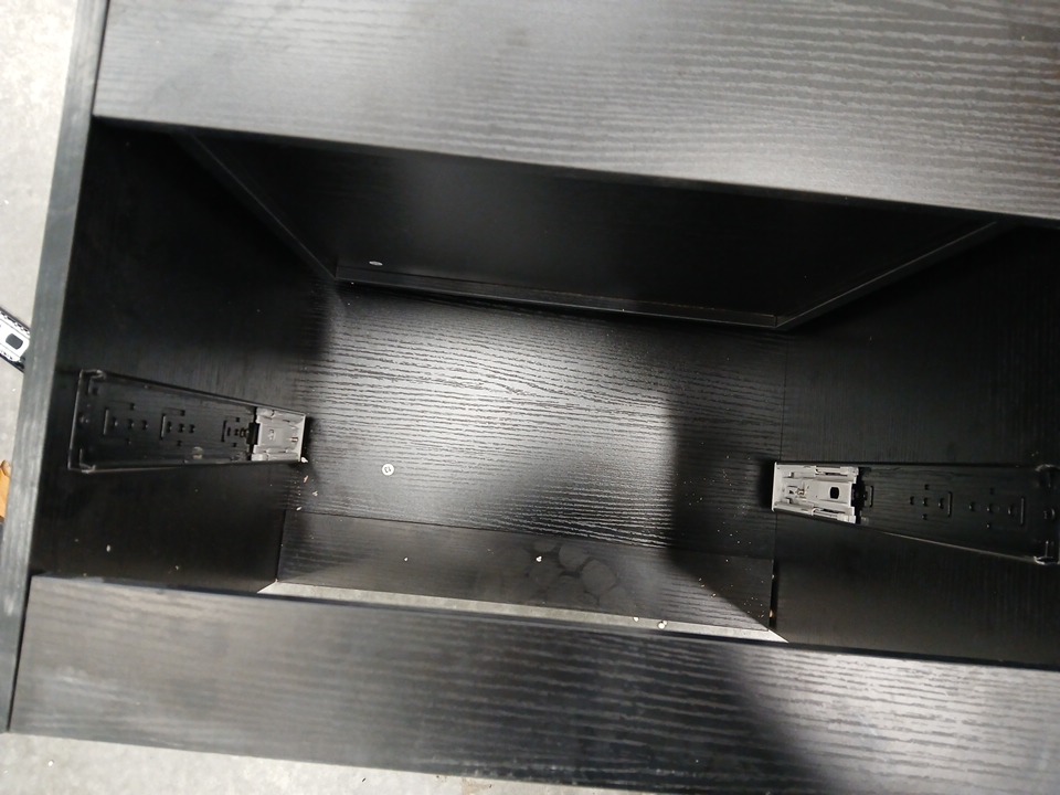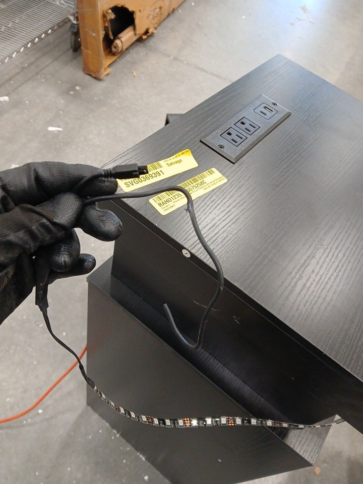 Item has been assembled fully Bottom drawer is missing one slide, and the frame is lightly loose and will need to have pieces pushed together LED strip has had its cord cut, and bottom drawer where assembled appears to have some heavy distressing
