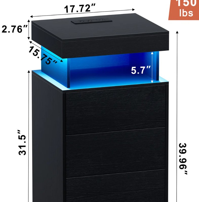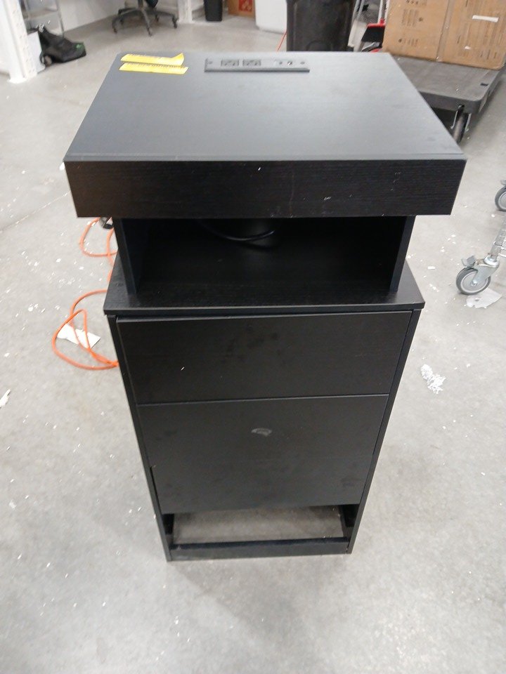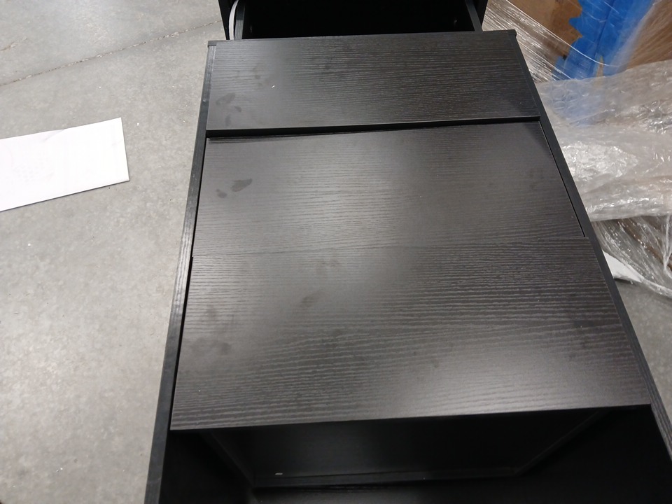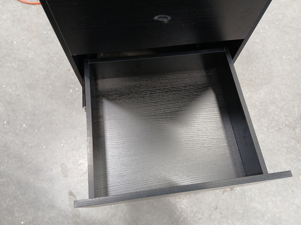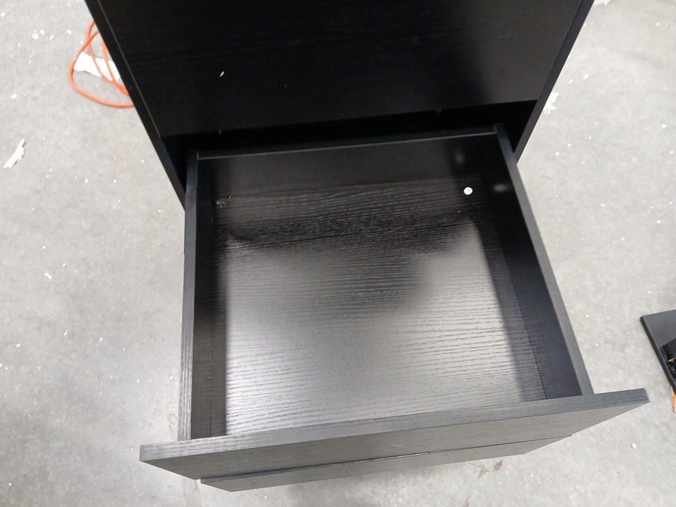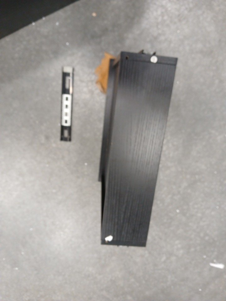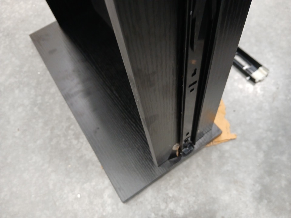 Item has been assembled fully Bottom drawer is missing one slide, and the frame is lightly loose and will need to have pieces pushed together LED strip has had its cord cut, and bottom drawer where assembled appears to have some heavy distressing