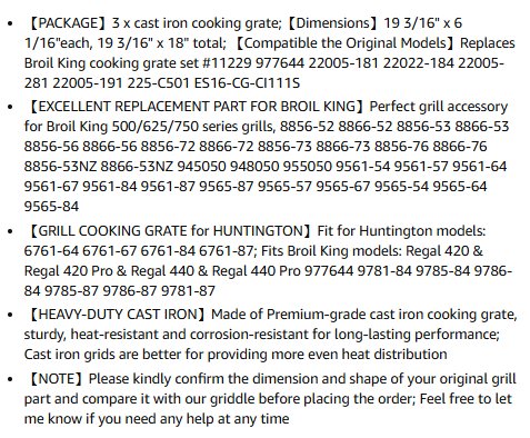 3PK MOASKER Cast Iron Cooking Grates FOR SELECT BROIL KING AND HUNTINGTON GAS GRILLS - 6 1/16" X 9 3/16" - BLACK (MODEL: 67845-5ZT)