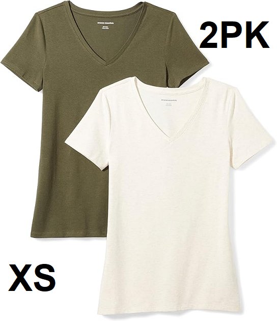 2PK WOMENS AMAZON ESSENTIAL V NECK T SHIRTS - EXTRA SMALL - GREEN/CREAM