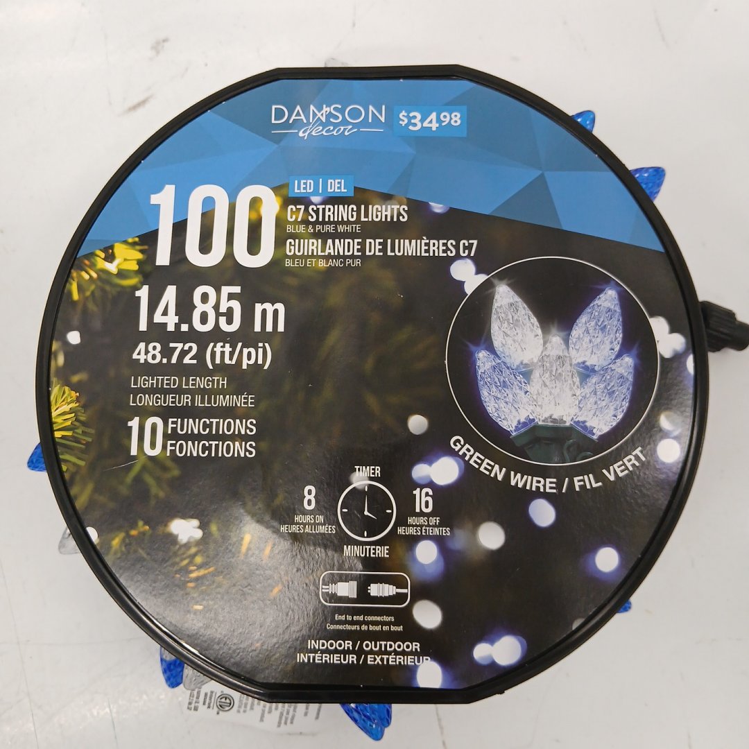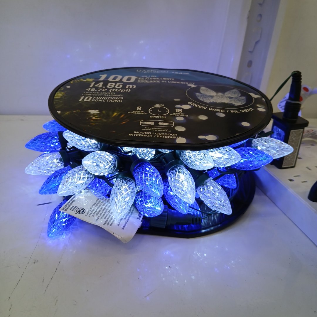 48.7FT DANSON DECOR 100 C7 HOLIDAY STRING LIGHTS - BLUE AND PURE WHITE , WITH GREEN WIRE (MODEL: XWCA81218j)