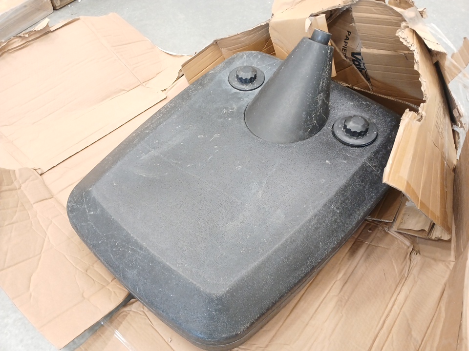 Our item does not come with wheels or an umbrella. This item is dirty from previous use