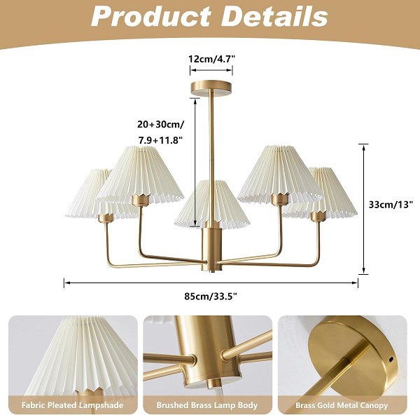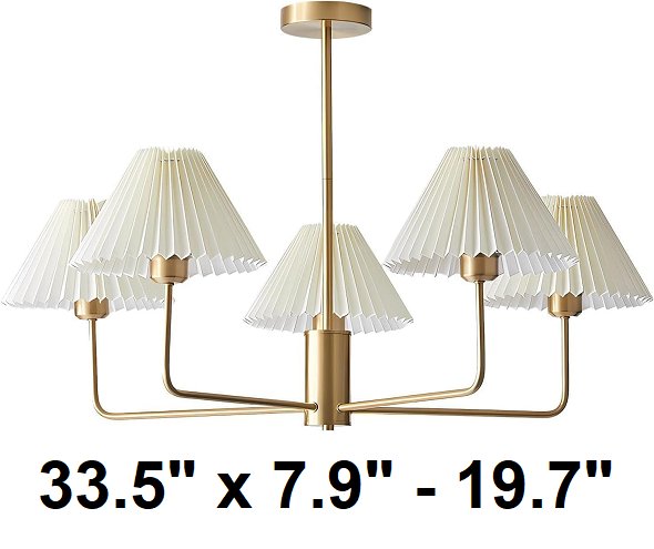 KCO Lighting mid century style chandelier pleated fabric 5-light adjustable height - 33.5" x 7.9" - 19.7" - gold/white(MODEL: L1157-5)