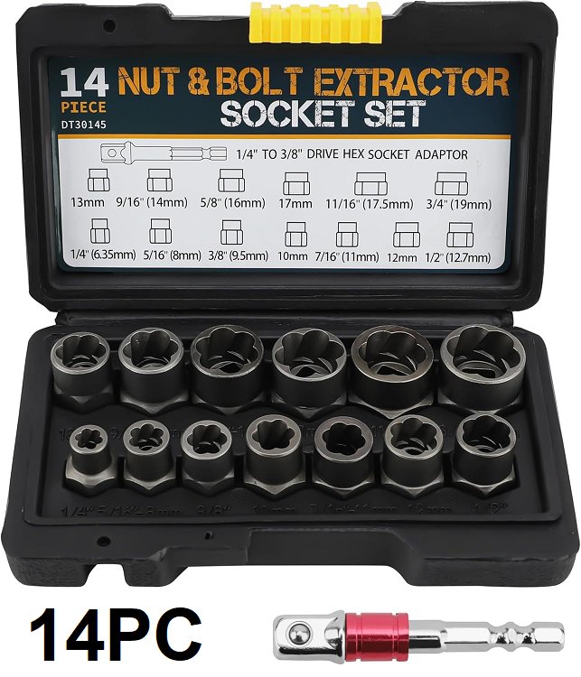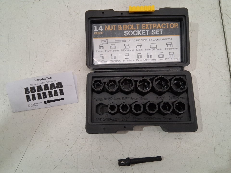 Please note this is supposed to be a 14pc set, but is missing the 1/4" (6.35mm) socket. There is some chipped paint on some of the sockets indicating previous use (see photos) Set includes: 5/16''(8mm), 3/8'', 10mm, 7/16''(11mm), 12mm, 1/2'', 13mm, 9/16''(14mm), 5/8''(16mm), 17mm, 11/16'', 3/4''(19mm). 1PCS 3/8" drive hex socket adapter