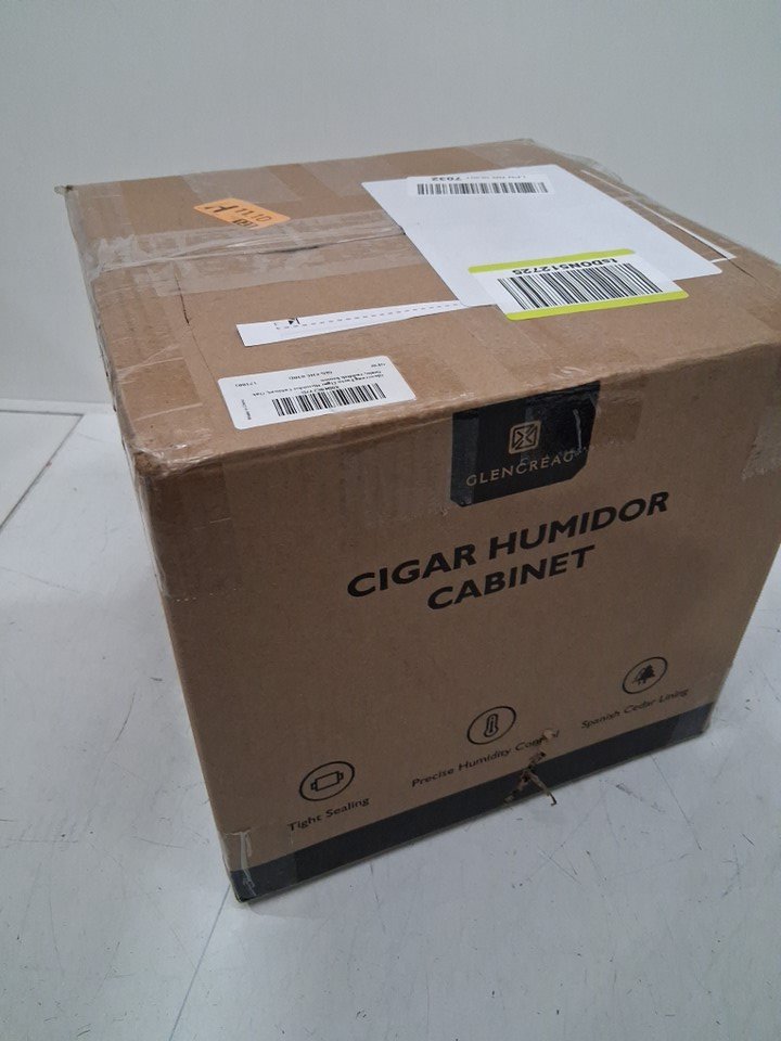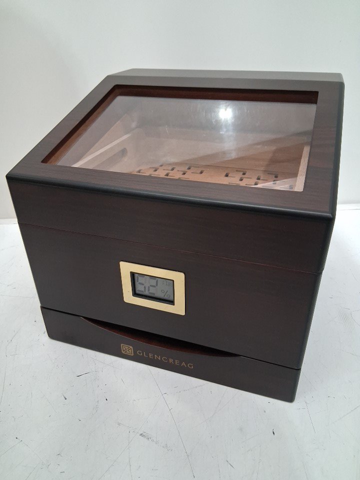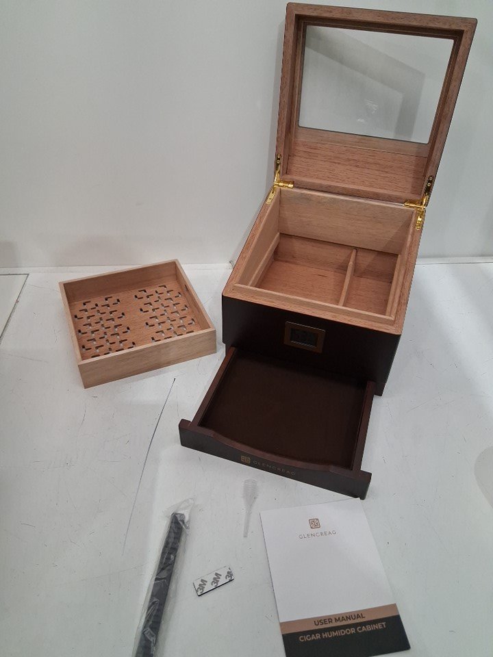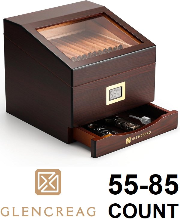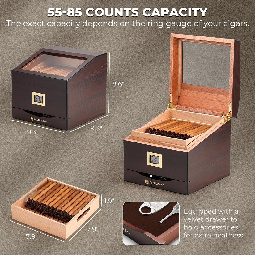 GLENCREAG CIGAR HUMIDOR BOX FOR 55-85 COUNT - SPANISH CEDAR LINING AND DIVIDER, DIGITAL HYDROMETER. ACCESSORY DRAWER, AND HUMIDIFIER - 9.3"L x 9.3"W x 8.6"H - DARK BROWNISH RED - (MODEL: FT-2042)