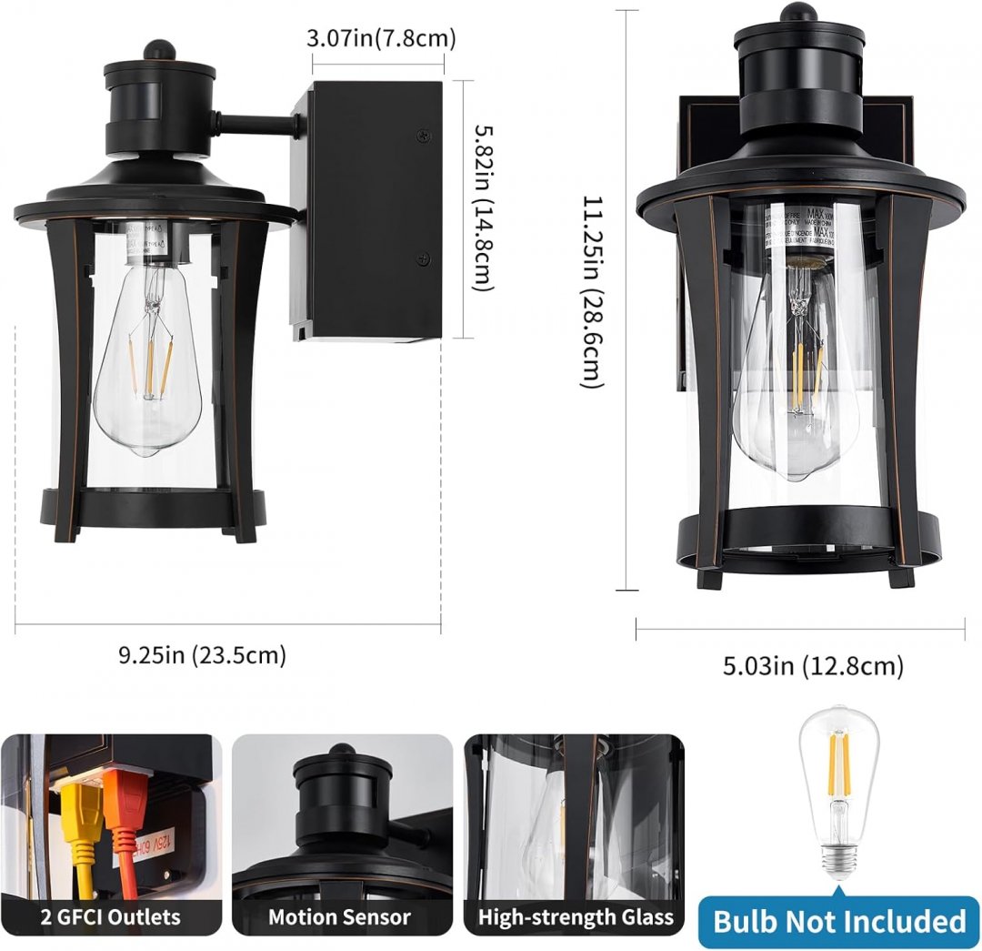 2pk yisuro Dusk to Dawn Motion Sensor waterproof exterior porch lights with gfci outlet - matte black (model: yx-105-b1-2p)