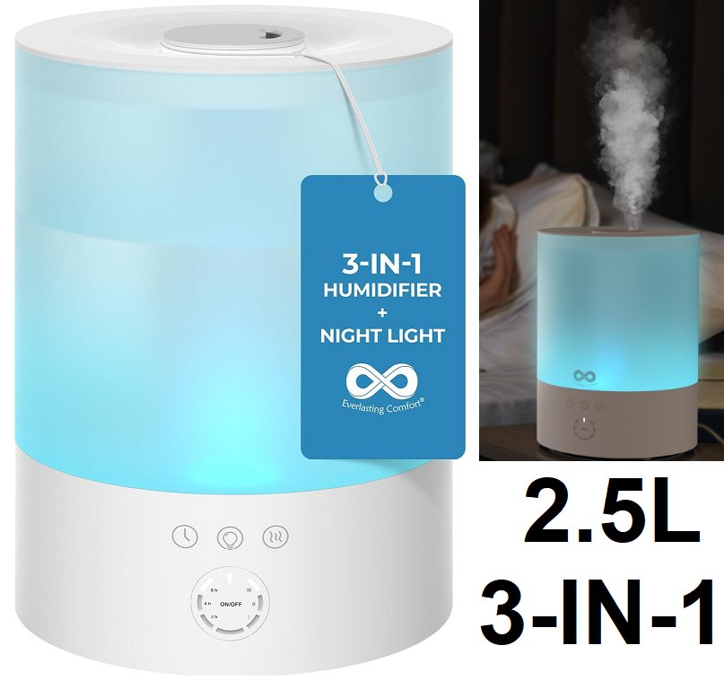 Everlasting Comfort 3-in-1 top fill humidifier night light with changing coloured lights - 2.5l - white (model: hu25-02)