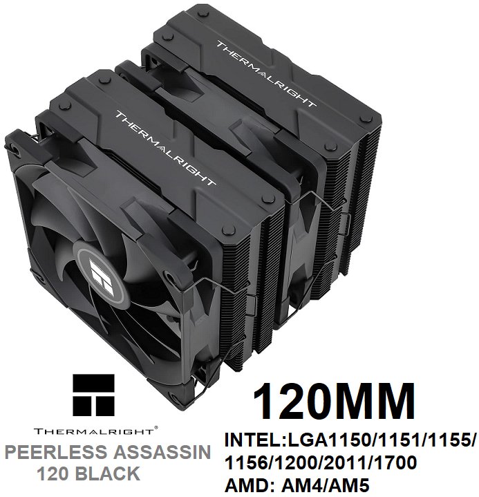 Thermalright Peerless Assassin 120 Black CPU Air Cooler, 6 Heat Pipes, Dual 120mm TL-C12B PWM Fan, Aluminium Heatsink Cover, AGHP Technology, - fits various AMD/INTEL CPU (MODEL: PA 120 Black-JND)