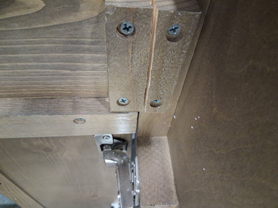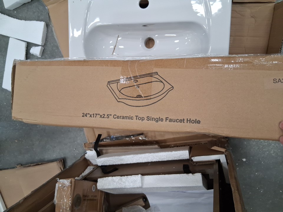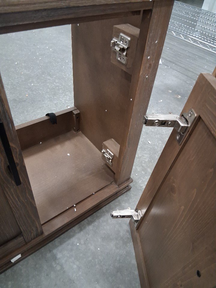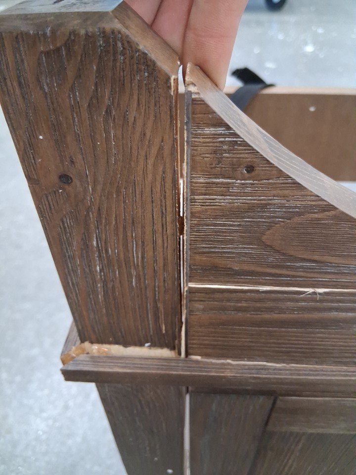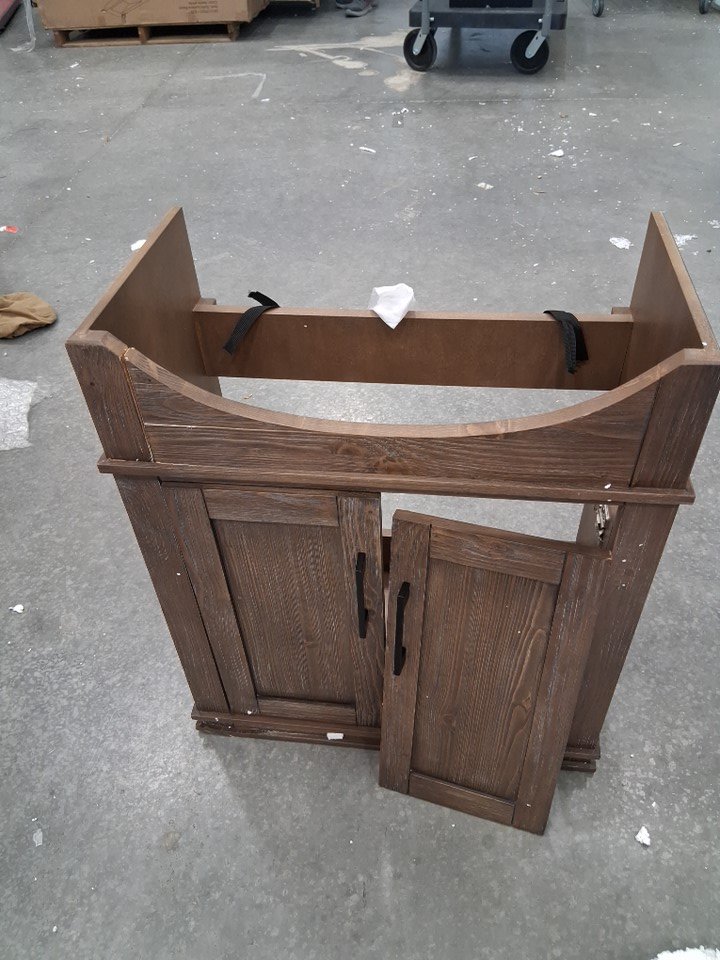 cracks in the wood, can be fixed with glue. small dent on bottom left of vanity. door can be reattached.