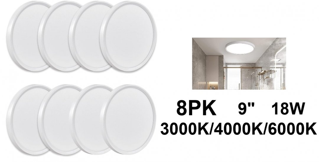 8PK FY WISDOM FLY LIGHTING LED Flush Mount Ceiling Light Fitures for Hallway, Kitchen, Bedroom, Laundry Room - 9" - 18W - 3000K/4000K/6000K - WHITE - (MODEL: FY101-D23025SW-DP18W)