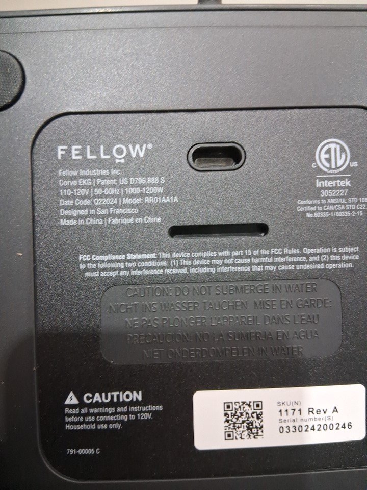 fellow Corvo EKG PRO Electric Kettle - 0.9L CAPACITY - BLACK (MODEL: rr01aa1a)