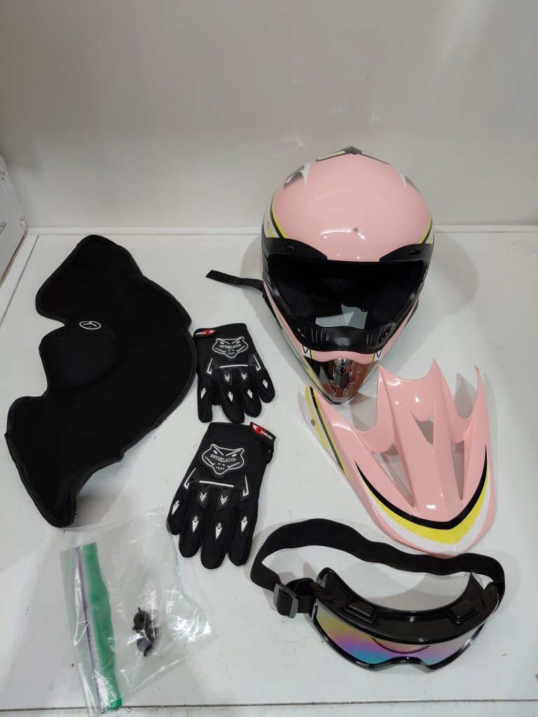 YOUTH modely motocross, mountain bike, atv full face helmet with goggles, gloves & face covering - dot certified - extra small - pink/black/yellow