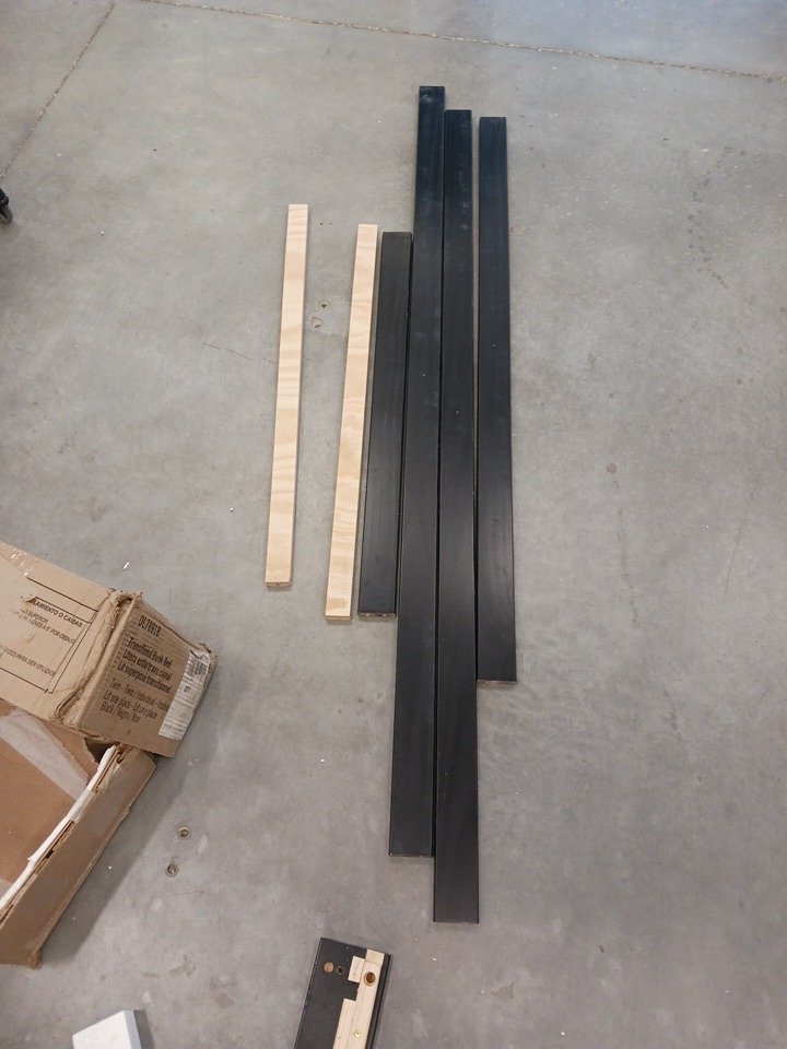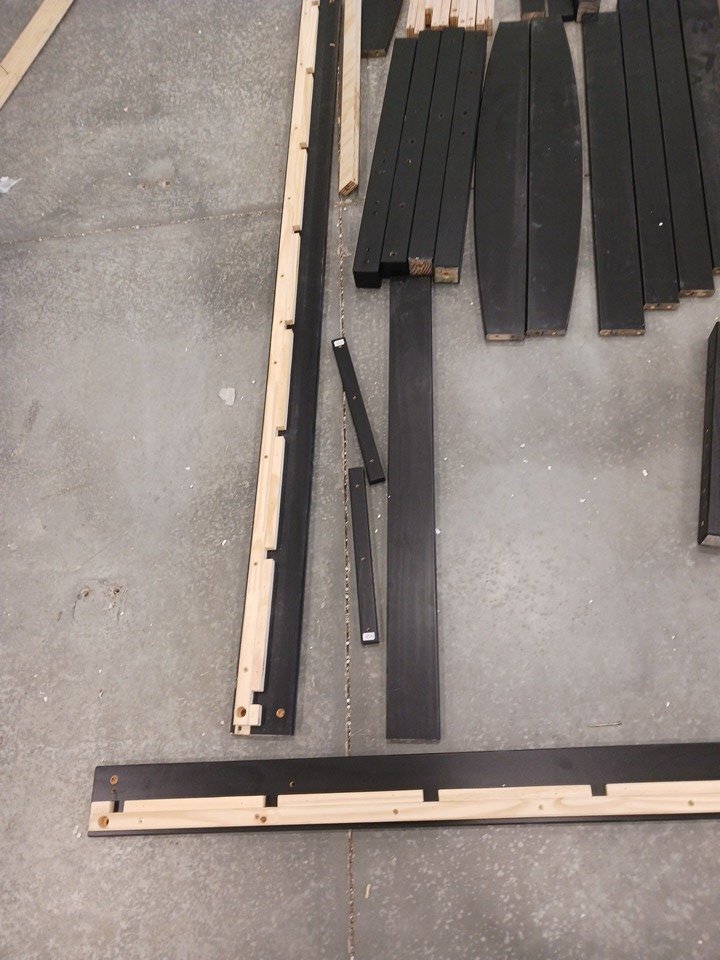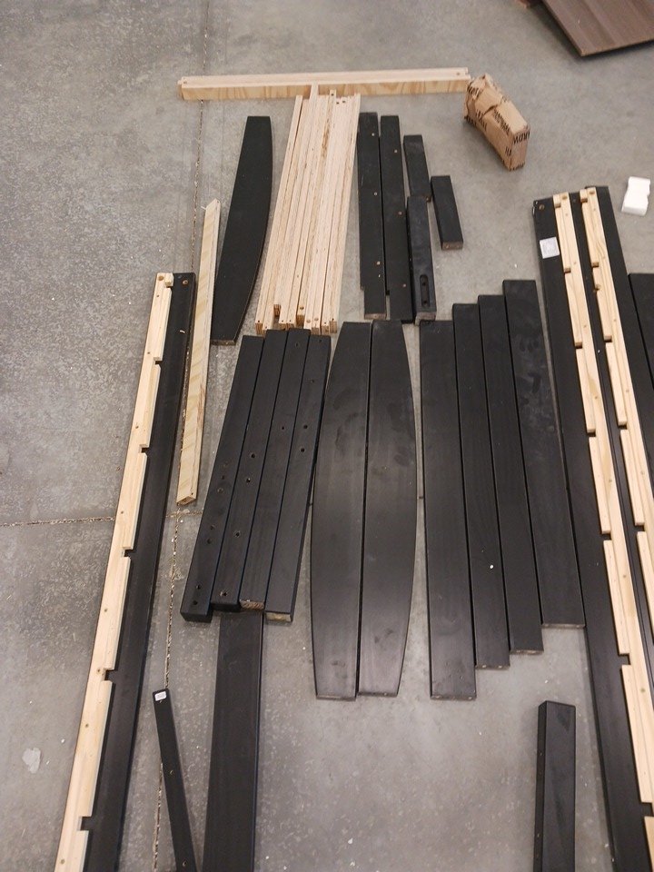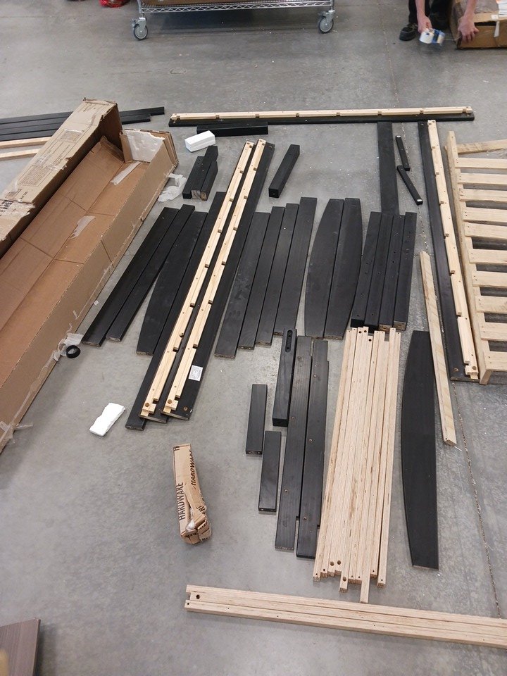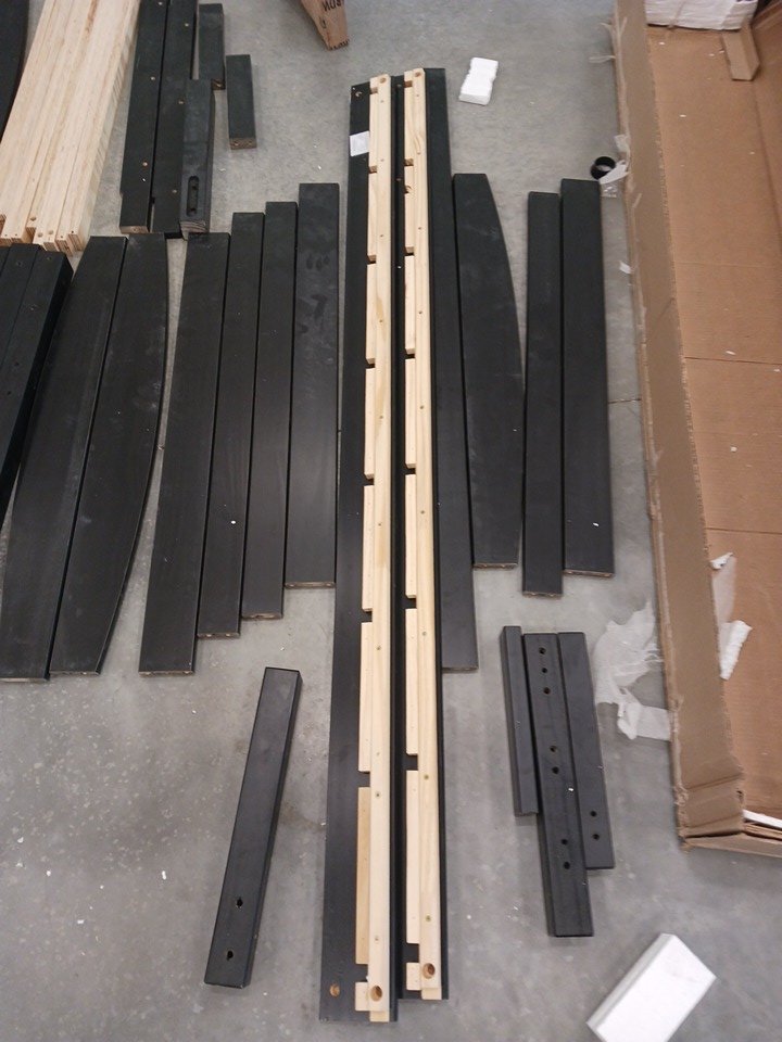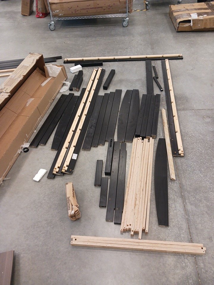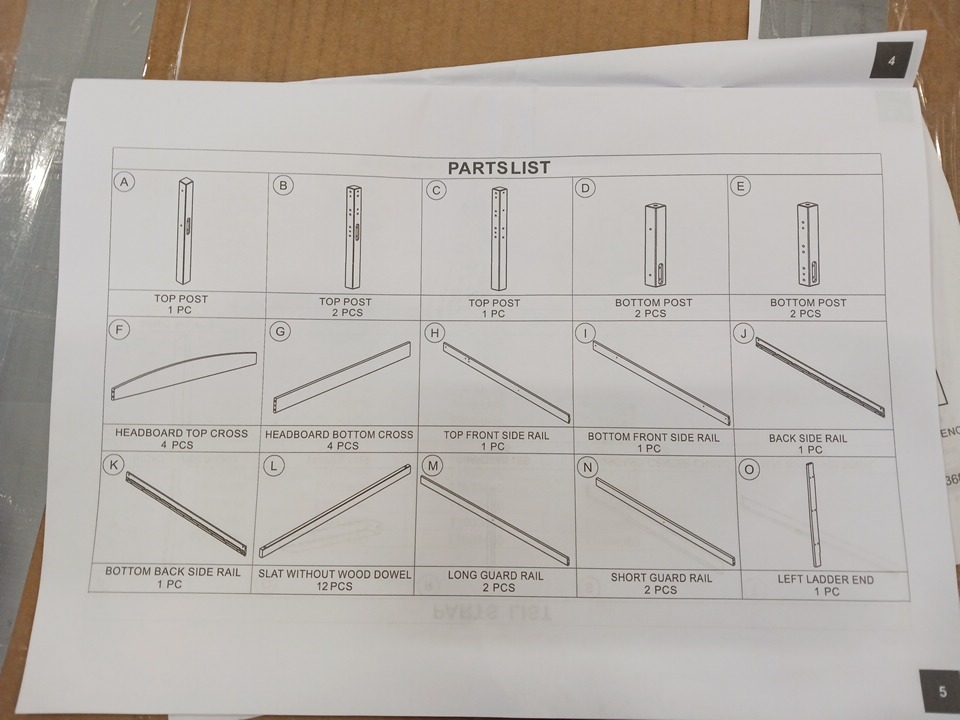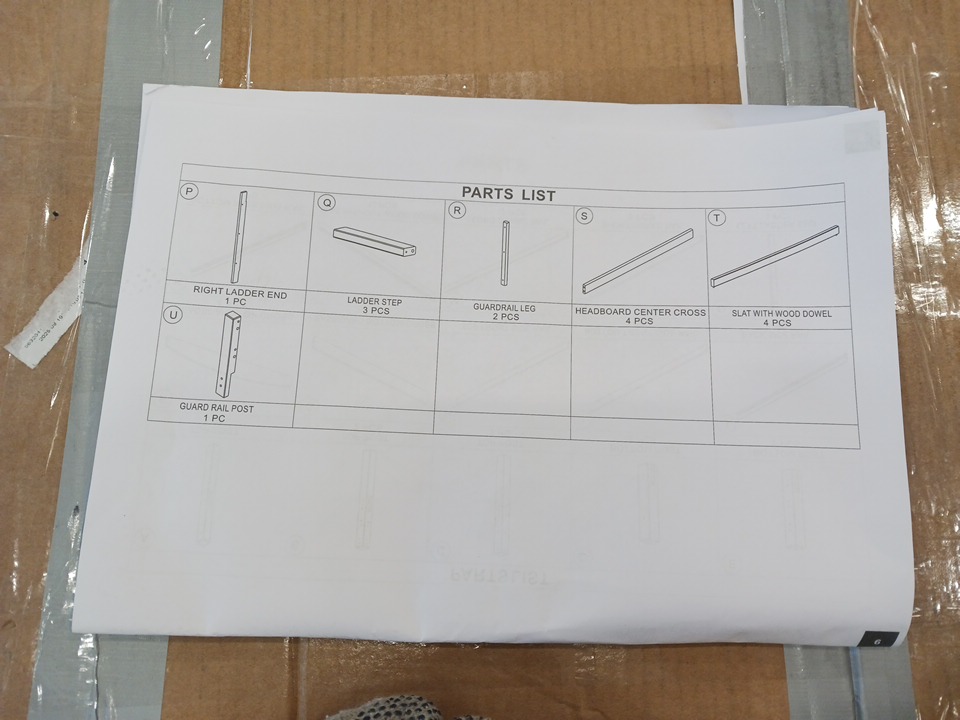All 52 assembly pieces and hardware components required for setup are present and verified. The metal frame sections, guardrails, and ladder components are in good condition, showing only light handling marks from storage.