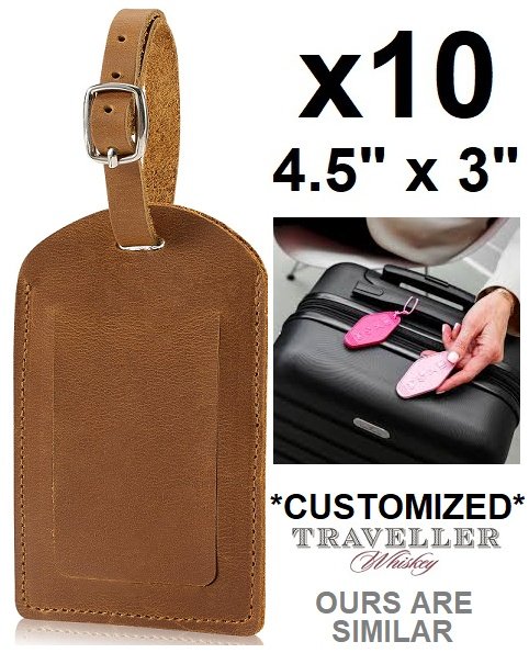 10 Faux Leather lanyard luggage tag holders with "Traveller Whiskey" logo engraved - 4.5" x 3" - Light Brown
