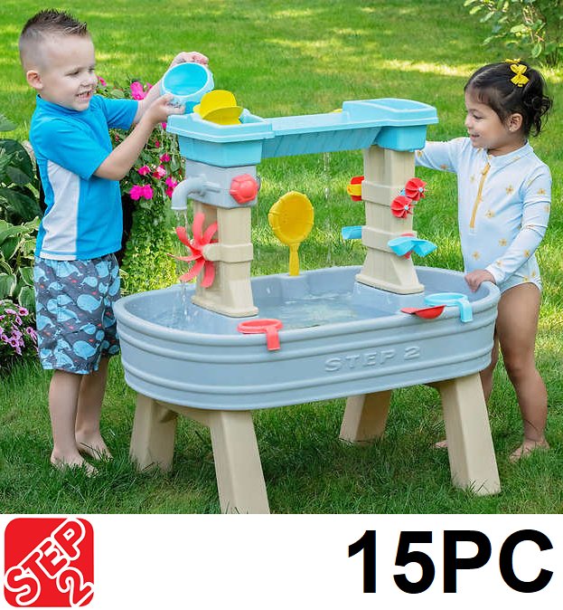 15pc step2 kids rain showers and flow water table - 36" X 35" X 23" - grey/beige/blue - (model: 432600/1740009)